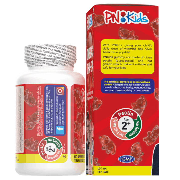 PNKids gummies are all made with plant-based Pectin. Pectin assist mineral absorption, is tooth-friendly, and has a soft texture that melts on the tongue.